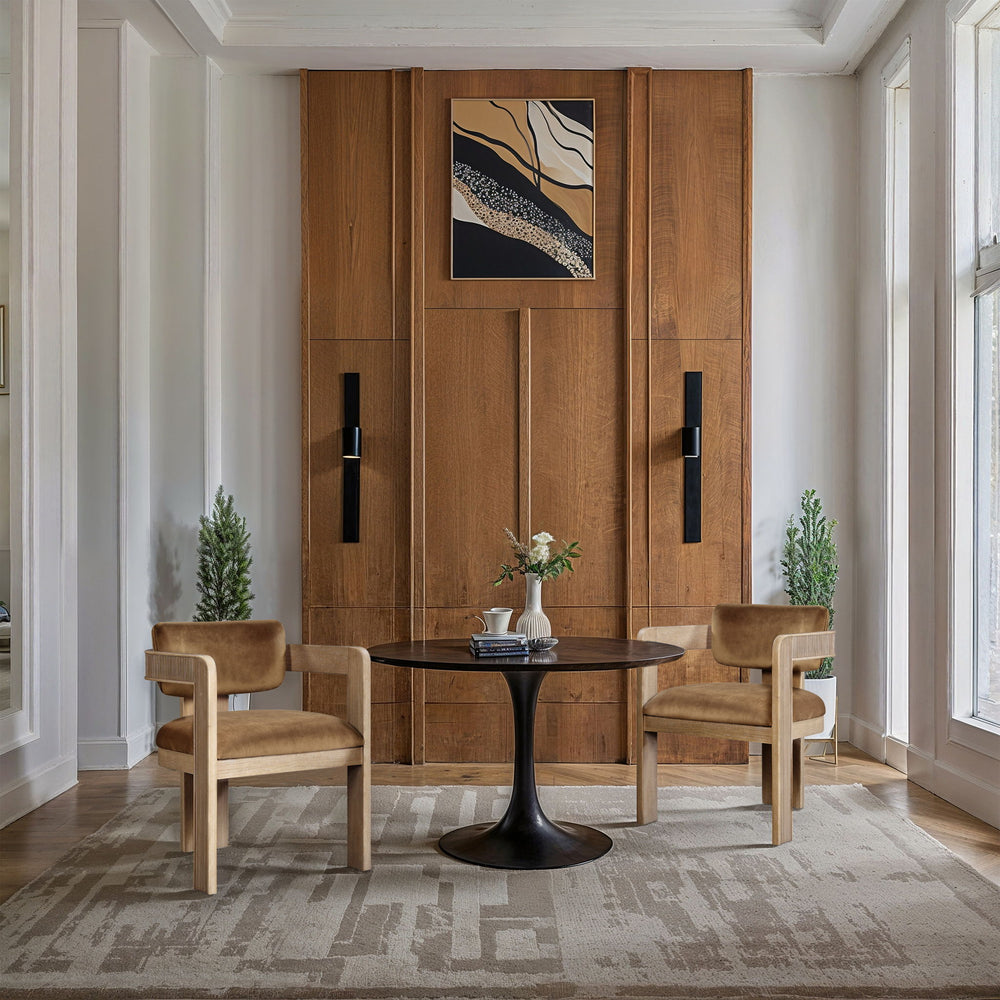 Elevate your counter seating with the Sacha saddle velvet upholstered dining chair, a perfect blend of refined texture and timeless craftsmanship. Wrapped in a soft, striking 460 GSM velvet, this chair offers both depth and sophistication. The solid wood frame, finished in a natural tone, showcases elegant fluted detailing, adding a touch of classic artistry.