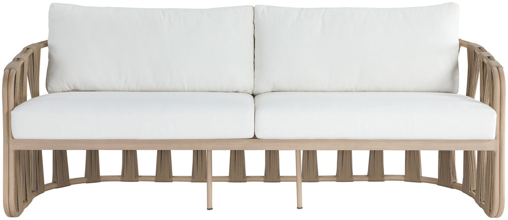 Woven polypropylene rope and resilient waterproof fabric give the San Pietro outdoor patio sofa a striking, art deco-inspired look. Wrapped in a natural aluminum teak frame, it's built to withstand the elements while maintaining its elegant appeal. Perfect for lounging outdoors, this piece blends sophisticated style with ultimate comfort.