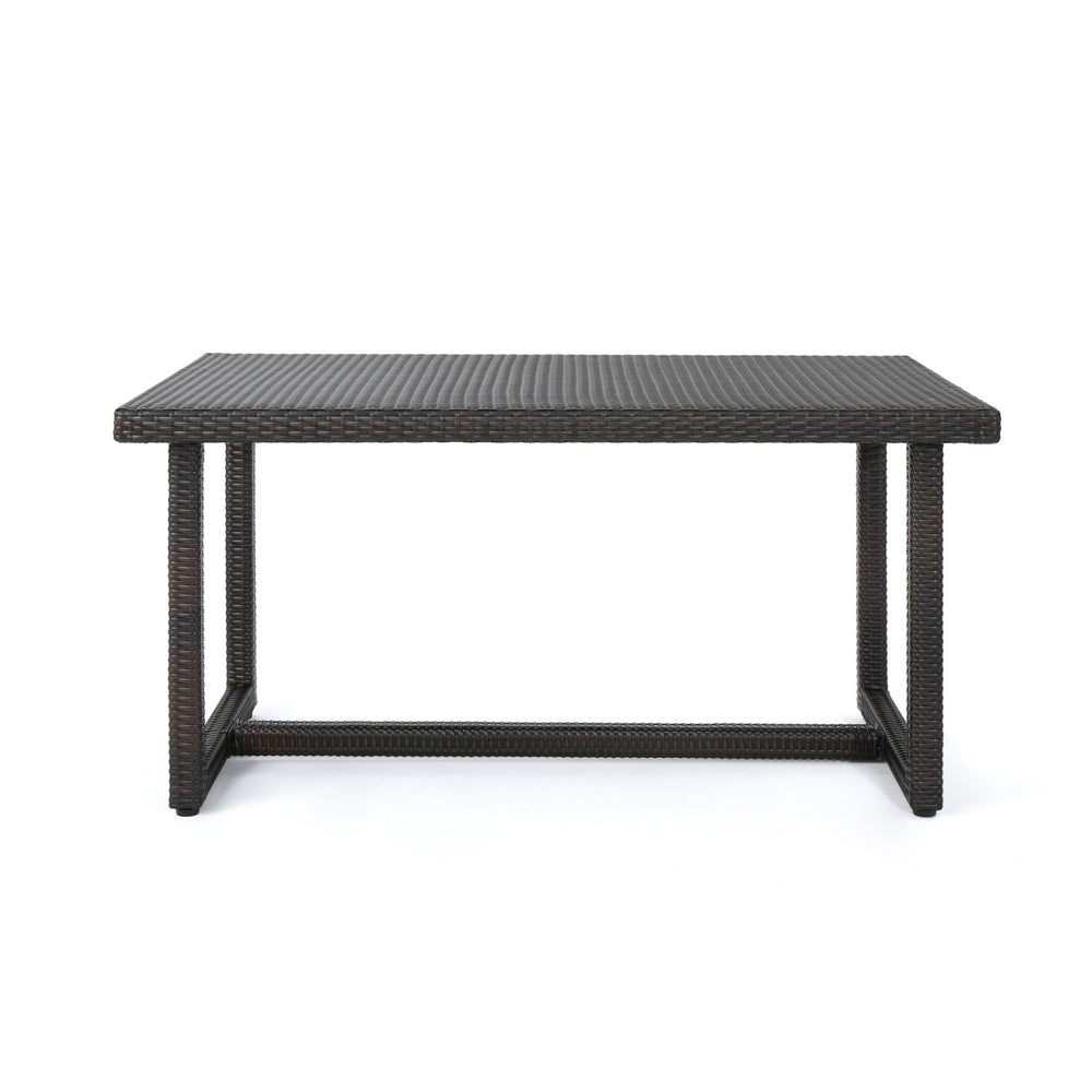 Weather-Resistant Construction: Founded atop an iron frame and wrapped in synthetic wicker, this outdoor dining table is built to withstand the elements, ensuring year-round durability and use, even in adverse weather conditions.