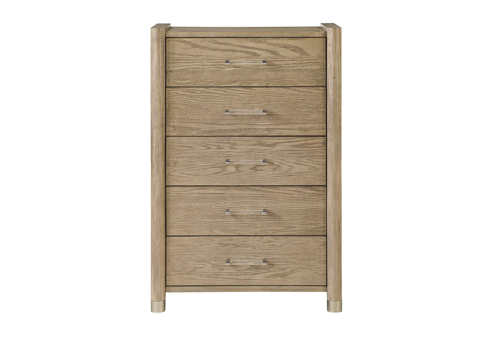 The Santo Chest offers generous vertical storage with a sleek profile and a warm brown oak finish. Its tall, streamlined design makes it ideal for maximizing storage in compact spaces while maintaining the cohesive, classic look of the Santo Collection.
