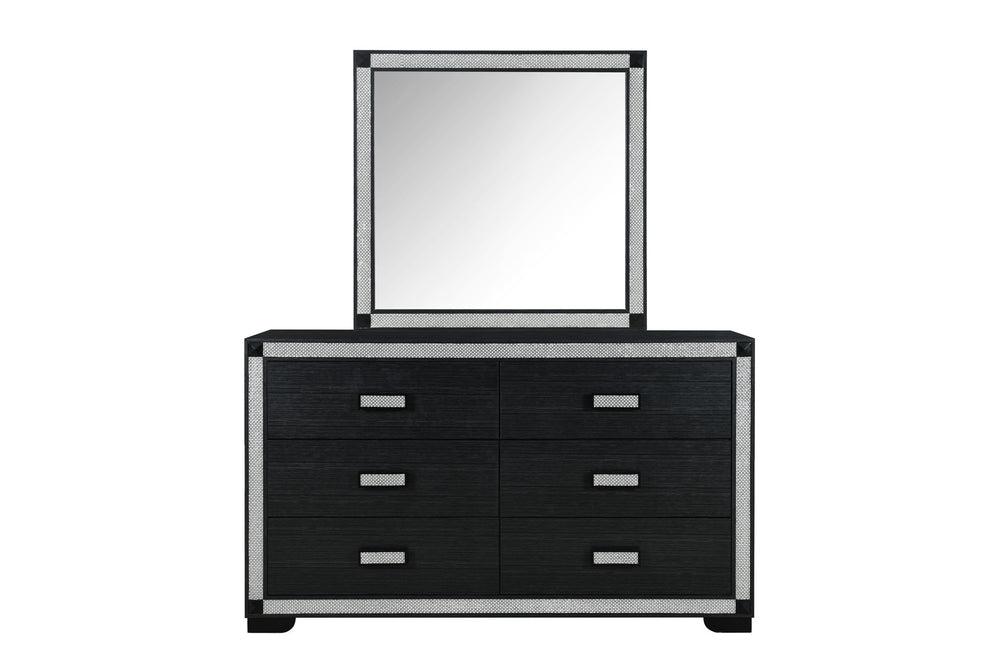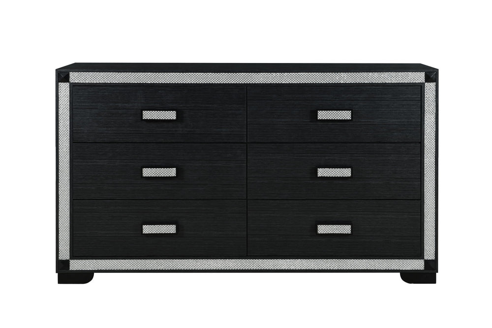 The Soleil Dresser offers both beauty and function. Its dark charcoal finish is wrapped with crushed crystal trim that catches the light beautifully, while its spacious drawers provide ample storage. Crystal-accented handles complete the look, making this piece as practical as it is dazzling.