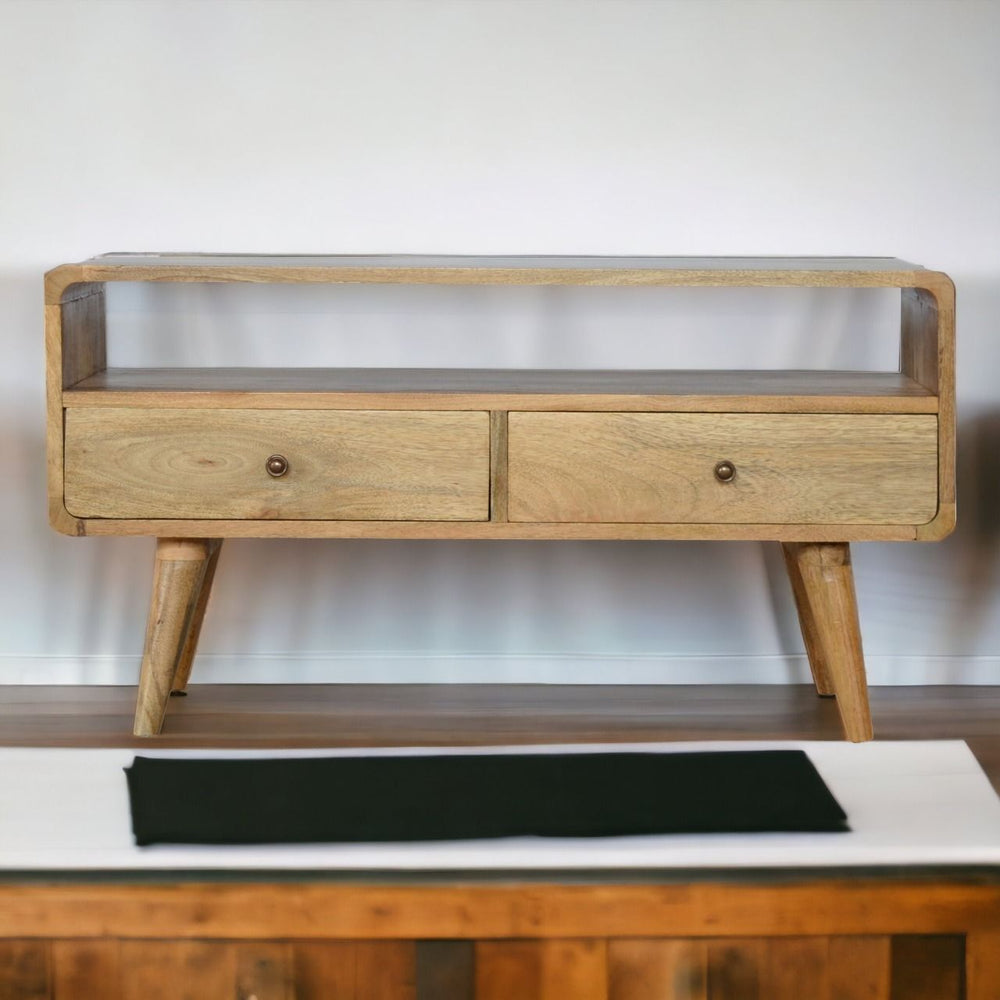 Artisan Furniture Solid Wood Curved Media Unit - Our solid timber media unit is expertly constructed from 100% solid mango wood in a lovely finish. This modern design offers clean, curved edges and features 2 drawers that come with a shiny knob, a large open slot to place any books, photo frames, ornaments, and 4 Nordic style legs.
