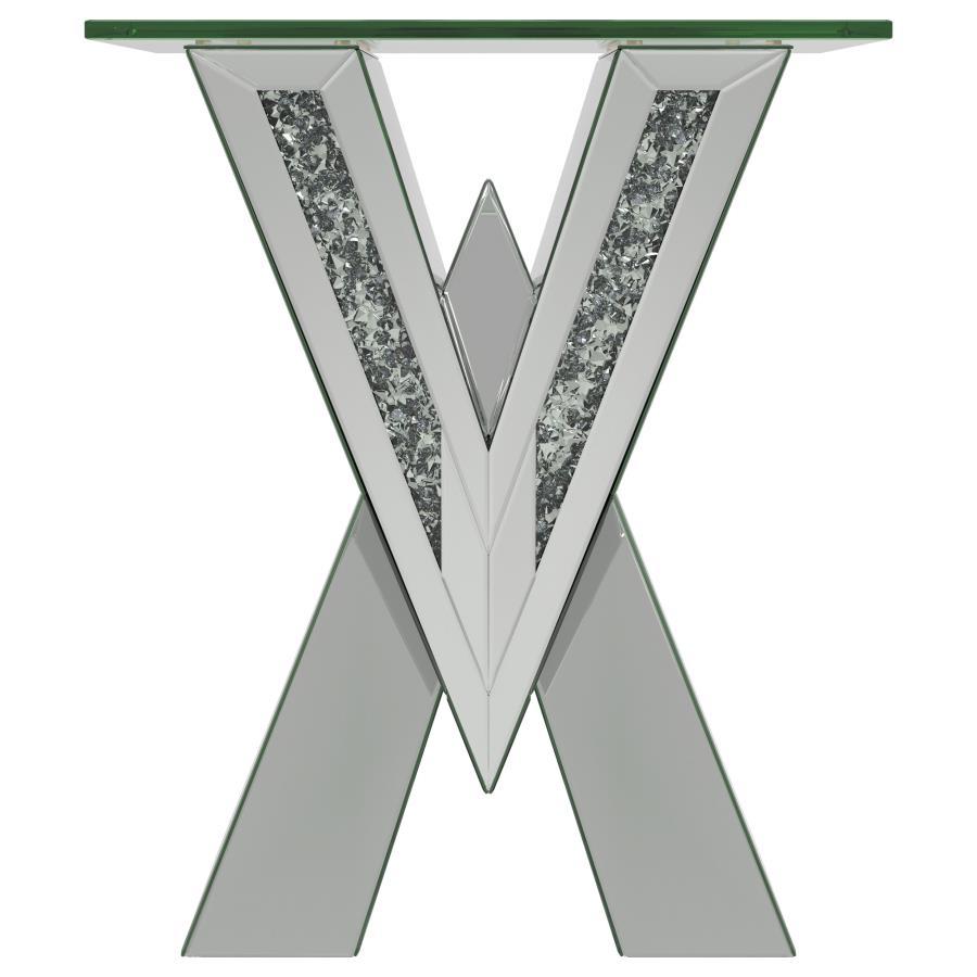 This mirrored table serves as a stunning centerpiece with its bold design. The V-shaped base showcases mirrored panels and sparkling crystal accents for an opulent look. The rectangular, beveled tempered glass top adds elegance and practicality, making this table ideal for entertaining or displaying decor. A striking blend of luxury and modern aesthetics, it elevates any living space.