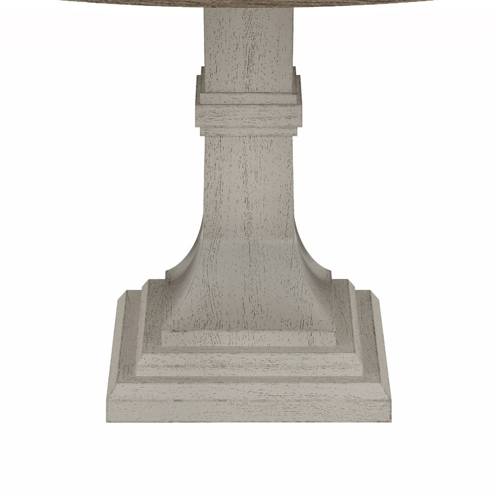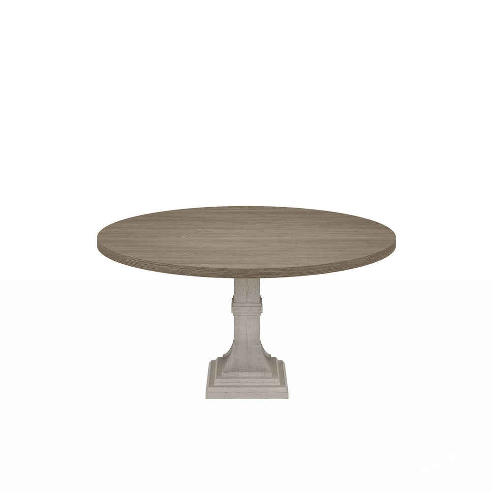 Crafted for those who appreciate the finer details in their dining space, the Tannen Dining Table presents a harmonious blend of sophistication and rustic charm. This elegantly designed table features a generous 59" round tabletop that gracefully sits atop a sturdy white pedestal base, ensuring both stability and style. The natural grain variation across the table's surface adds an organic touch, beautifully contrasted by a distressed finish that brings an air of lived-in luxury to any room. This dining table promises durability and a timeless appeal, making it a perfect centerpiece for gatherings, meals, and memorable conversations.