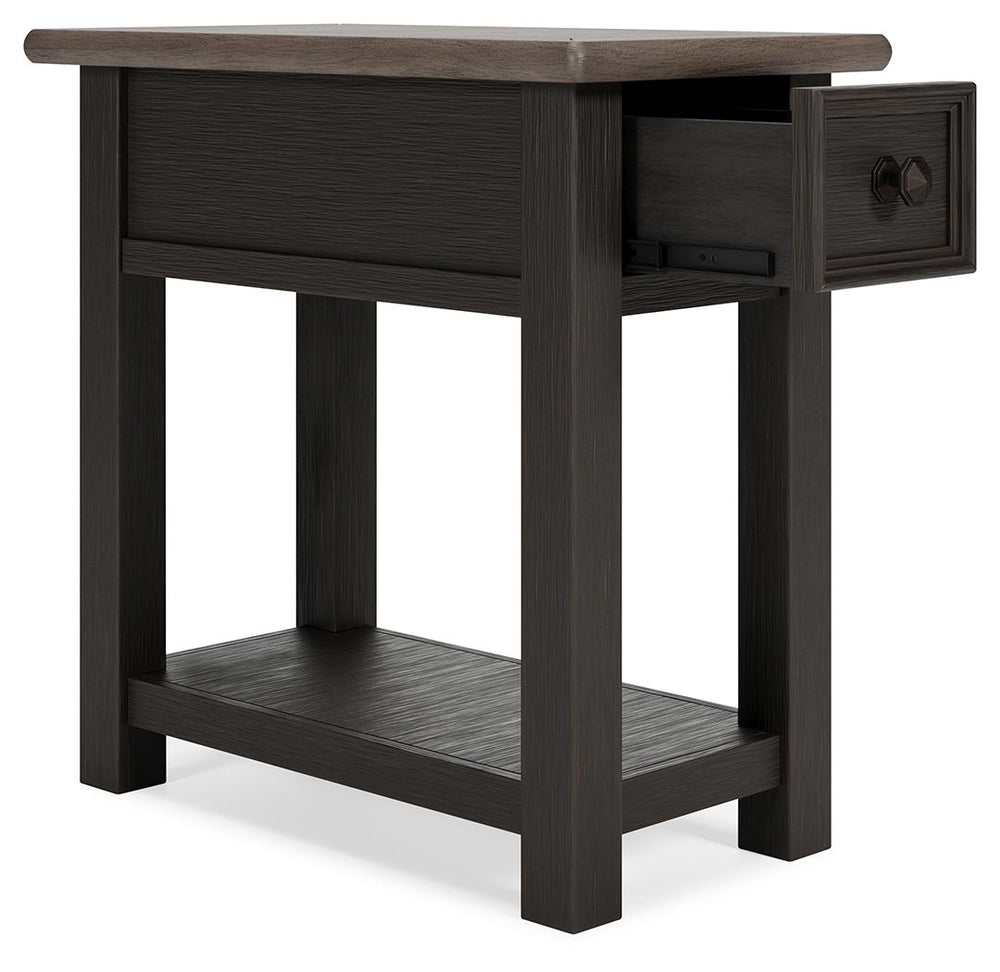 Quality crafted and richly styled, this rectangular chairside end table is sure to charm. Its two-tone aesthetic pairs a weathered grayish brown tabletop with a textured wire brushed base in black. A built-in shelf offers handy display space. And the table's integrated 110V power supply and dual USB charging ports make it so easy to keep your personal devices powered up.