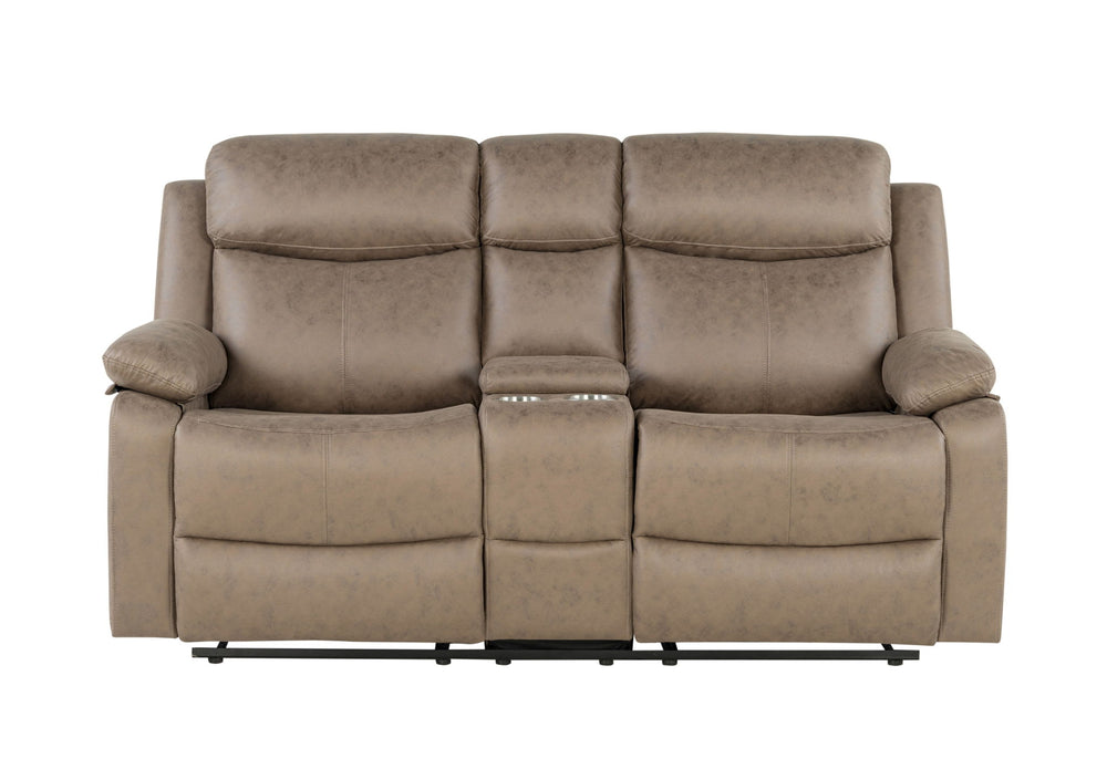 Enjoy both comfort and functionality with the U6026 Console Reclining Loveseat. This loveseat, upholstered in dark brown brushed microfiber, features generously padded cushions and a smooth reclining mechanism for ultimate relaxation. The built-in cupholders and convenient storage compartment add a practical touch, making it perfect for entertaining or cozy nights in.
