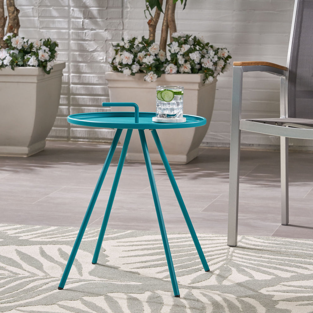 Modern Design: The side table features a modern aesthetic with its circular design, bold, straight legs, and clean lines. Its distinctive look is further enhanced by a carrying handle and four angled legs that contrast beautifully with the circular tabletop.