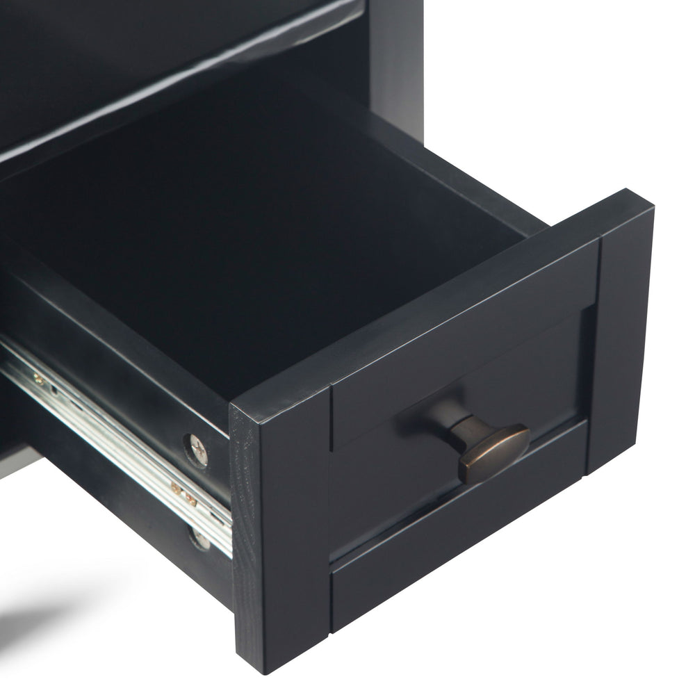Features bottom drawer with metal drawer glides and large open shelf for storage