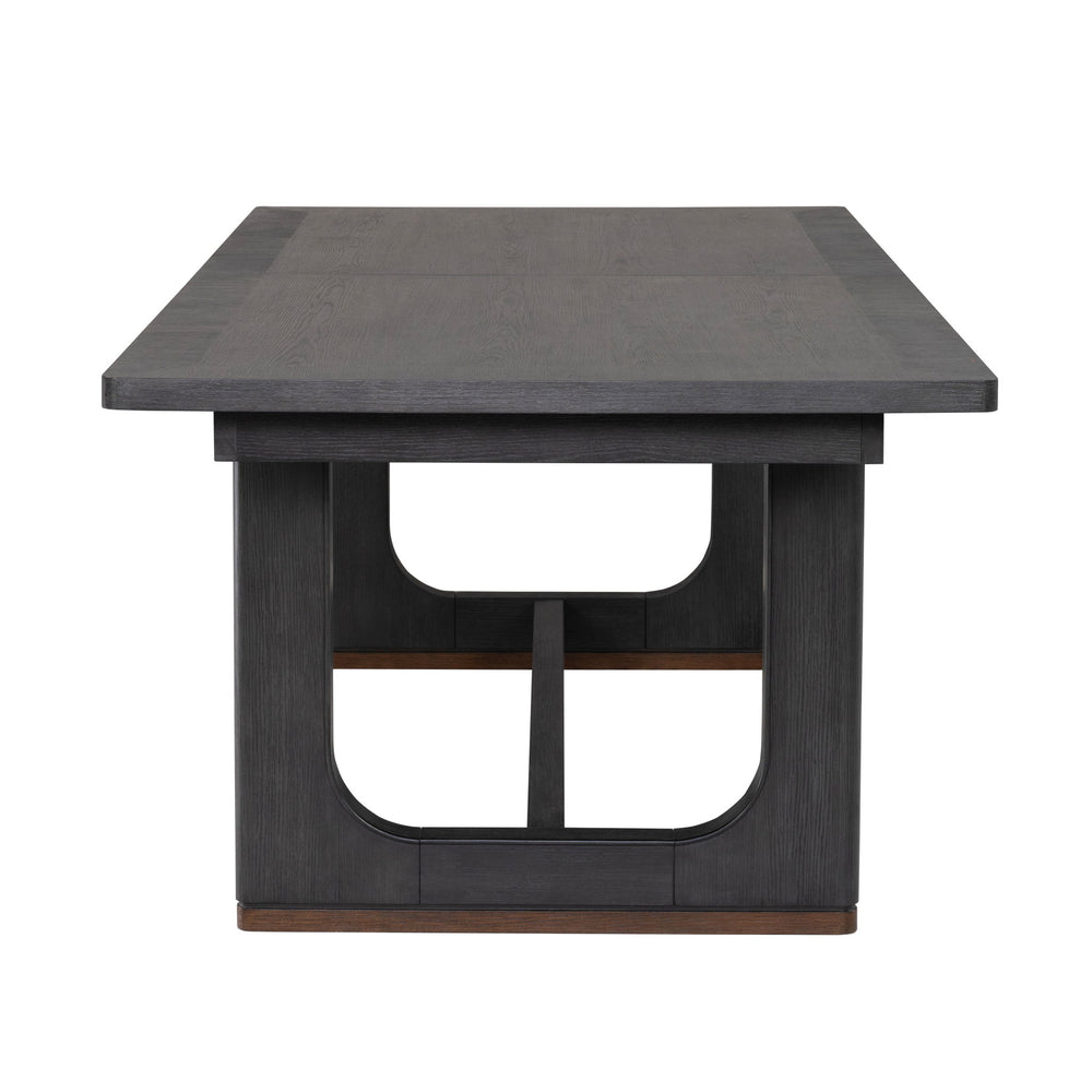 The perfect centerpiece for your next dinner party, this gorgeous dining table brings the ultimate in transitional style. The deep ebony finish fits seamlessly with the rich brown base accents for an on-trend color combination. Meticulously crafted from rubberwood solids and oak veneers, this piece is built to be everlasting. Complete with an 18” inch butterfly leaf that extends the table to a vast 100”, you’ll have ample space to host up to eight guests. The graceful namesake waterfall edges give this table true elegance.