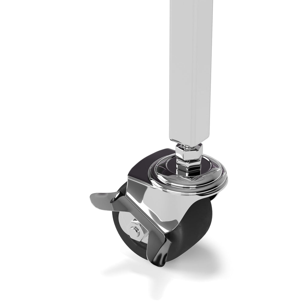 Features Black toughened glass top and bottom shelves, one rack for hanging glasses, three rings for bottle storage, four caster wheels – two that lock and handle/pull