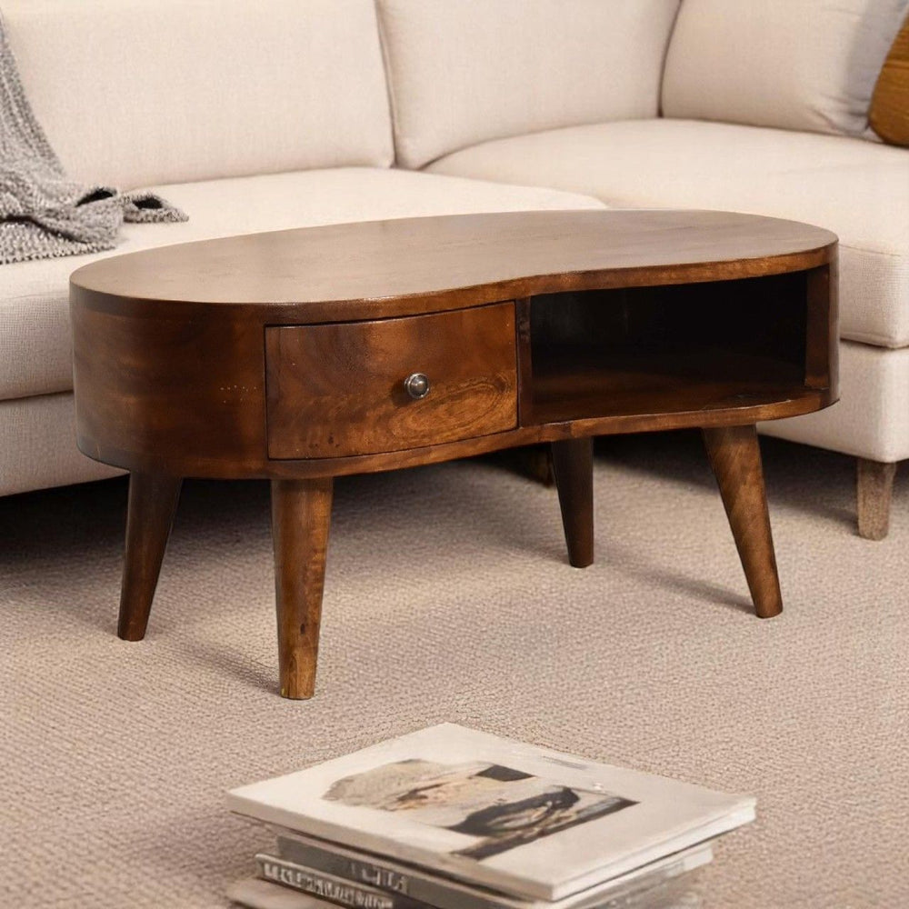Artisan Furniture Solid Wood Large Wave Coffee Table - This solid wood coffee table has been constructed from 100% solid mango wood in a finish and offers a unique shaped design with rounded edges. It features one open slot and one drawer with a shiny knob and Nordic-style legs. A great simple and add to the bedroom.