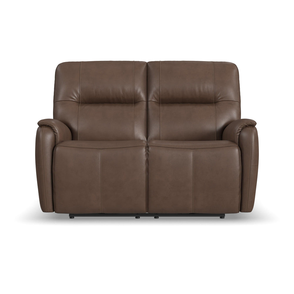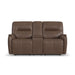 Add sleek sophistication to your living spaces with the Wilson power reclining loveseat with console. Its thin profile design and subtle curves lend a timeless, elevated style, while a handy console offers convenient storage. The pad-over arms, waterfall chaise and center-divided back provide unmatched support for effortless relaxation, while the power recline and headrest allow for customized comfort. Upholstered in a high-quality, cafe brown top grain leather, this loveseat features Flexsteel's patented Blue Steel Spring™ at the heart of each seat, proving unmatched comfort and durability that you can count on.