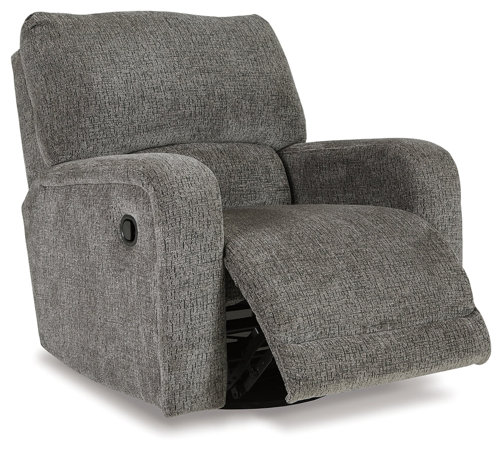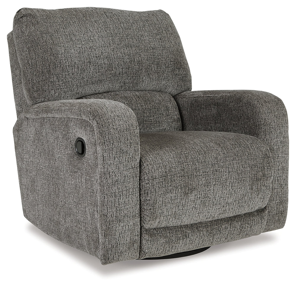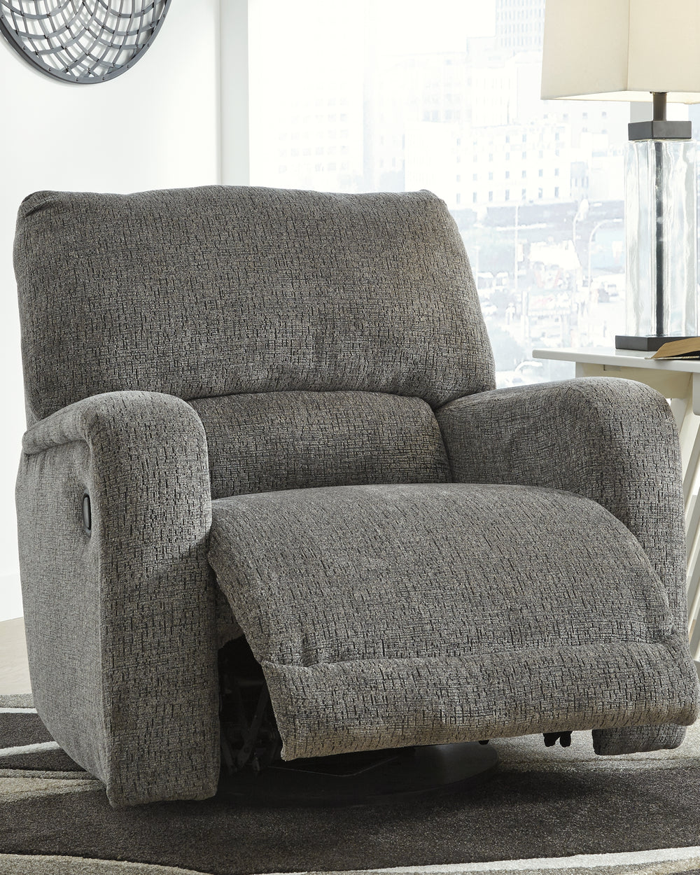 You and plush cushions are two peas in a pod. That’s why this swivel glider recliner will quickly find its way to your heart. Chenille fabric feels so good, you’ll never want to take your hands off of it. Track arms elevate the look with a touch of contemporary sensibility. Ease back into relaxation on the deep seating with one easy pull. Complete with 360-degree swivel, this recliner sets the bar for comfort.