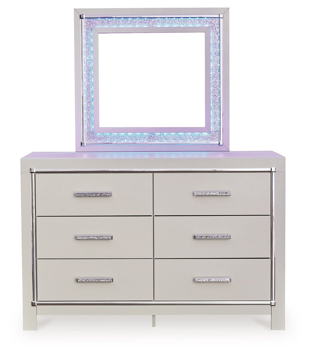 Bright, bold luxury. This dresser with mirror dazzles with its attention to detail. Your love of glamorous style is reflected in its all-over faux gator in a metallic finish, exquisitely paired with faceted chrome-tone details. Complete with LED lighting around the mirror, it inspires you to live luxuriously every day—whether dressing up to go out or dressing down to stay in.